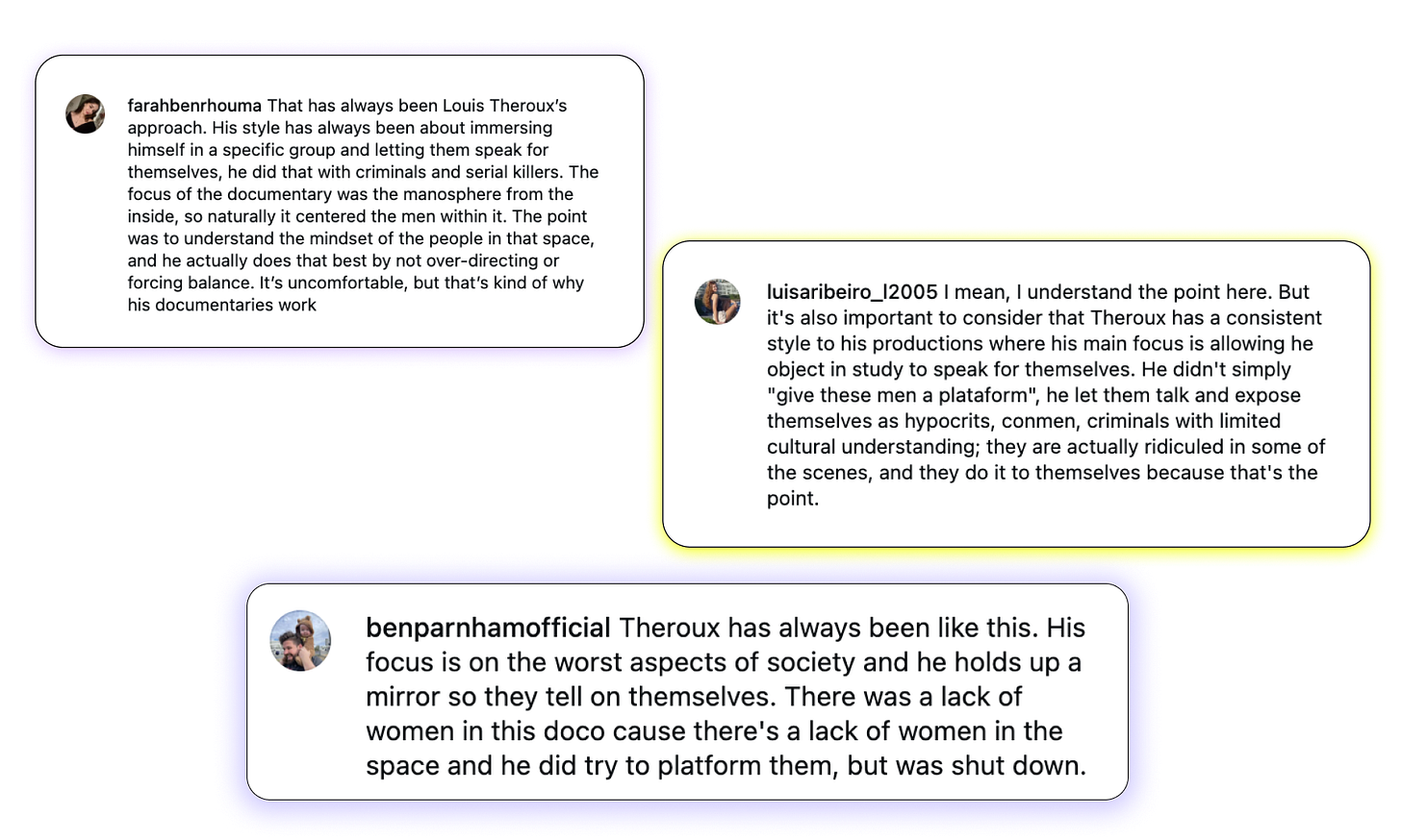 For many viewers, the lack of women represented in the documentary was a non-issue, with most citing Theroux’s journalistic style as a fair reason.
